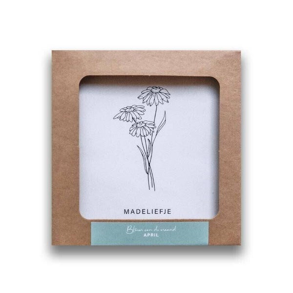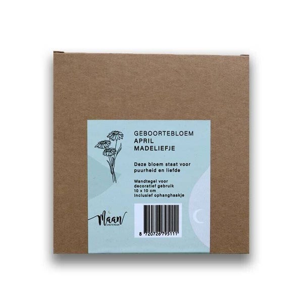 Tegeltje met geboortebloem Madelief van de maand april. Aan de achterzijde van het tegeltje zit een haakje waarmee je het aan de muur kunt hangen. Of zet het op een mooi zichtbaar plekje in huis.