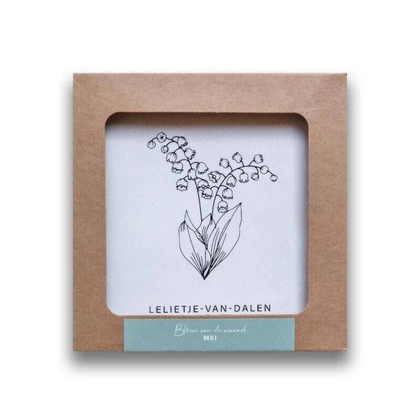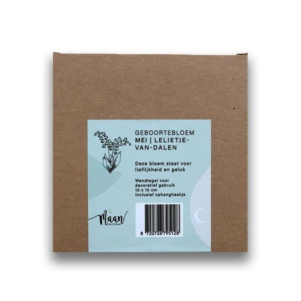 Tegeltje met geboortebloem Lelietje van Dalen van de maand mei. Aan de achterzijde van het tegeltje zit een haakje waarmee je het aan de muur kunt hangen. Of zet het op een mooi zichtbaar plekje in huis.