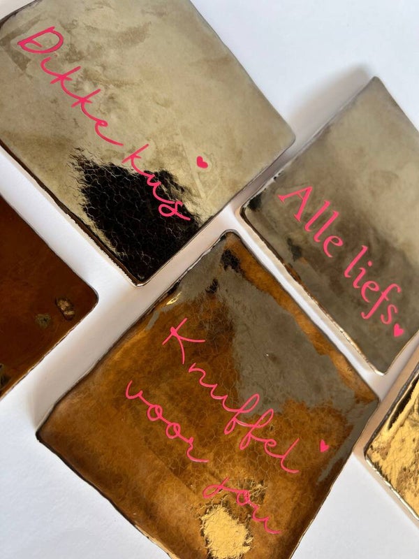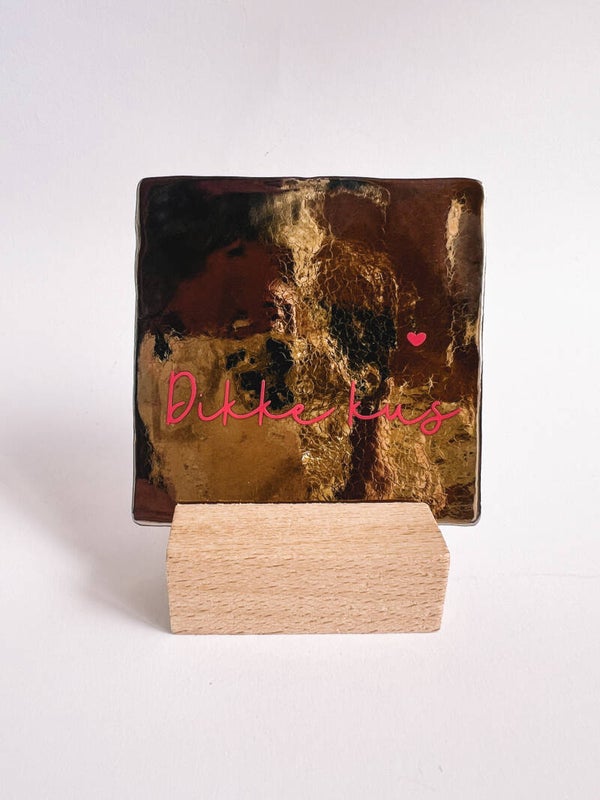 Een brons kleurig tegeltje met de tekst: Dikke kus. Lief om op te sturen naar iemand die wel een hart onder de riem kan gebruiken.