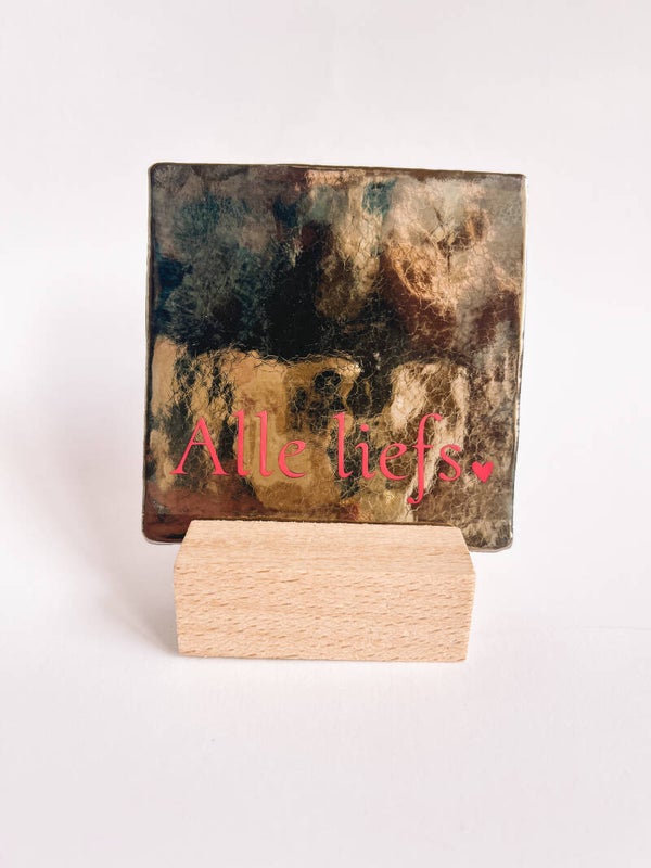 Een brons kleurig tegeltje met de tekst: Alle liefs. Mooi om op te sturen naar iemand die wel een hart onder de riem kan gebruiken.