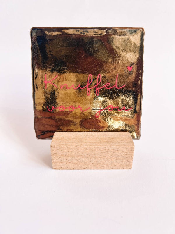 Een brons kleurig tegeltje met de tekst: Knuffel voor jou. Mooi om op te sturen naar iemand die wel een hart onder de riem kan gebruiken.